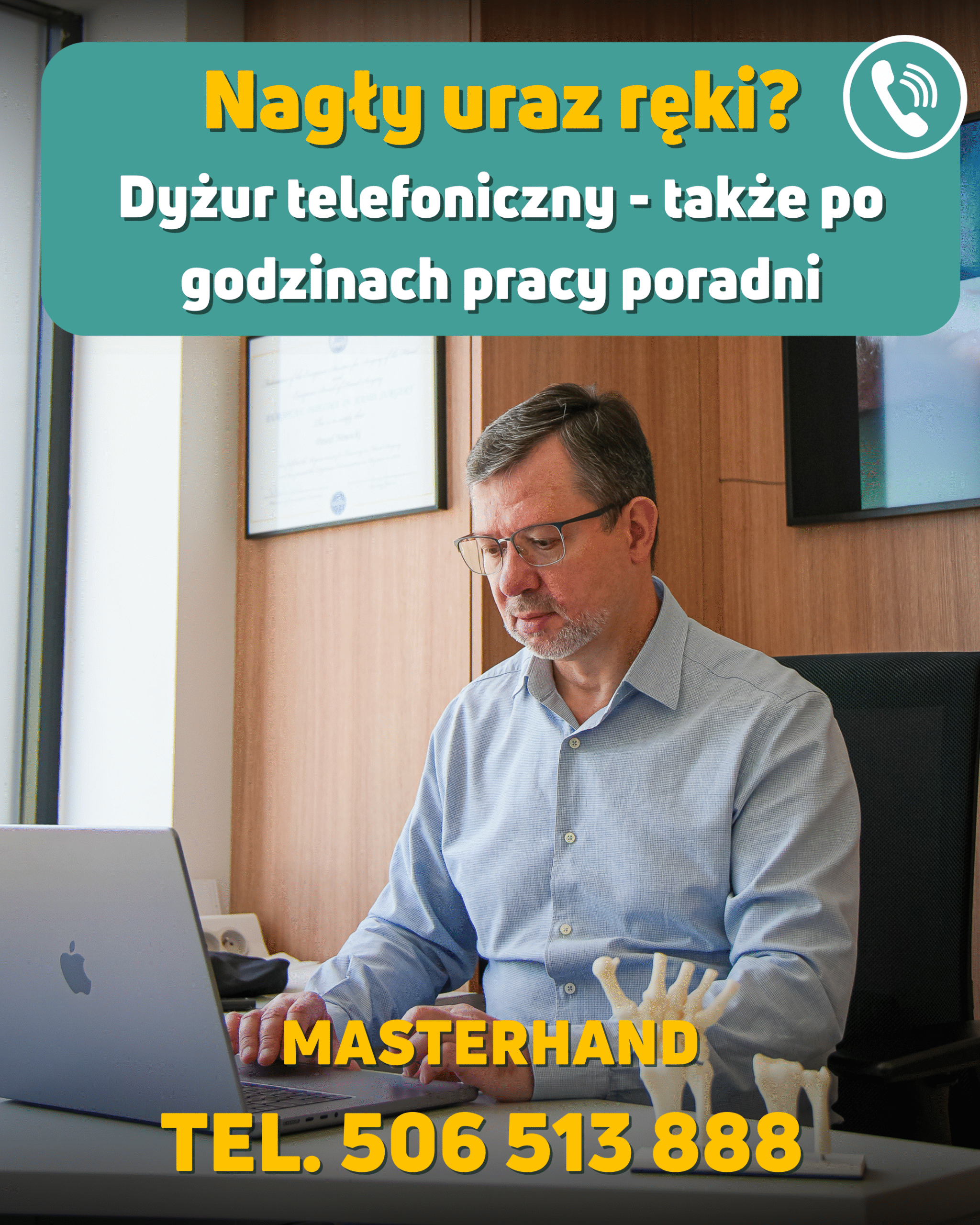 Uraz ręki po godzinach pracy poradni? Nie jesteś sam. W nagłych przypadkach Poradnia Chirurgii Ręki Masterhand uruchomiła dyżur telefoniczny także poza godzinami pracy.